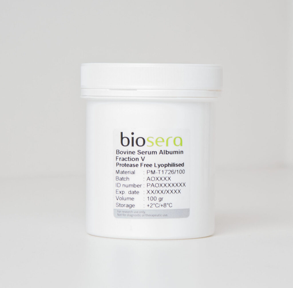 L’albumine sérique bovine lyophilisée (ASB) est obtenue par une méthode de choc thermique exclusive qui évite l’utilisation excessive de solvants organiques dénaturants. Avant la lyophilisation, l’ASB est filtrée à 0,2 µm. Les virus potentiels sont inactivés par un chauffage à 65°C pendant 3 heures. Elle ne contient pas de protéase.